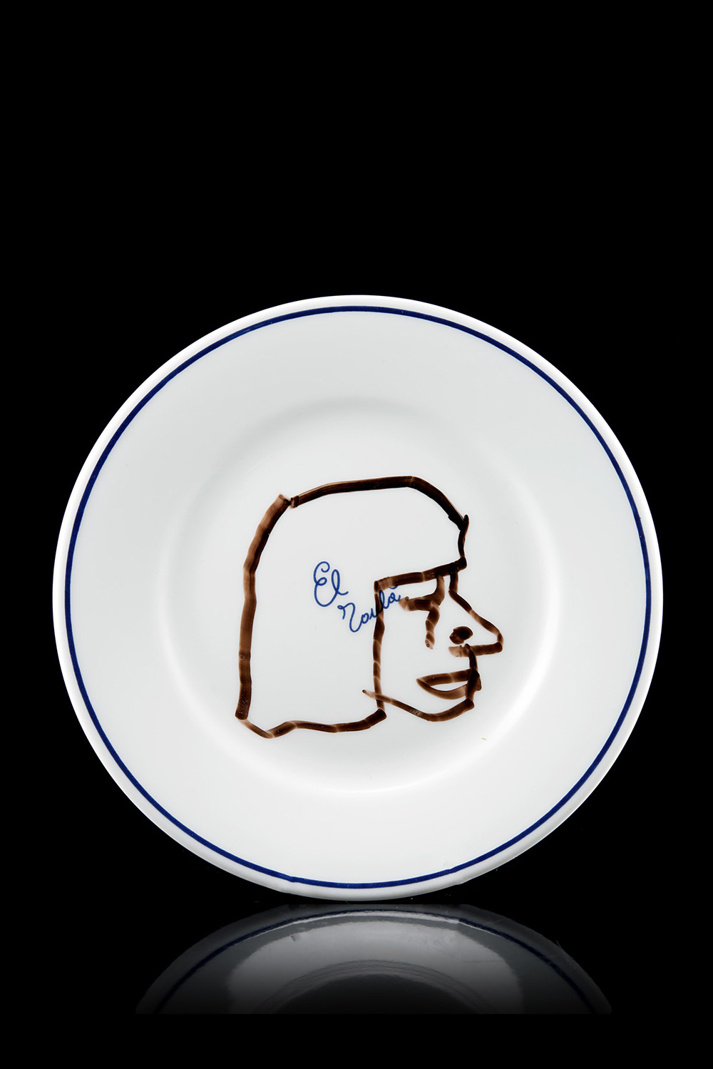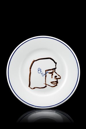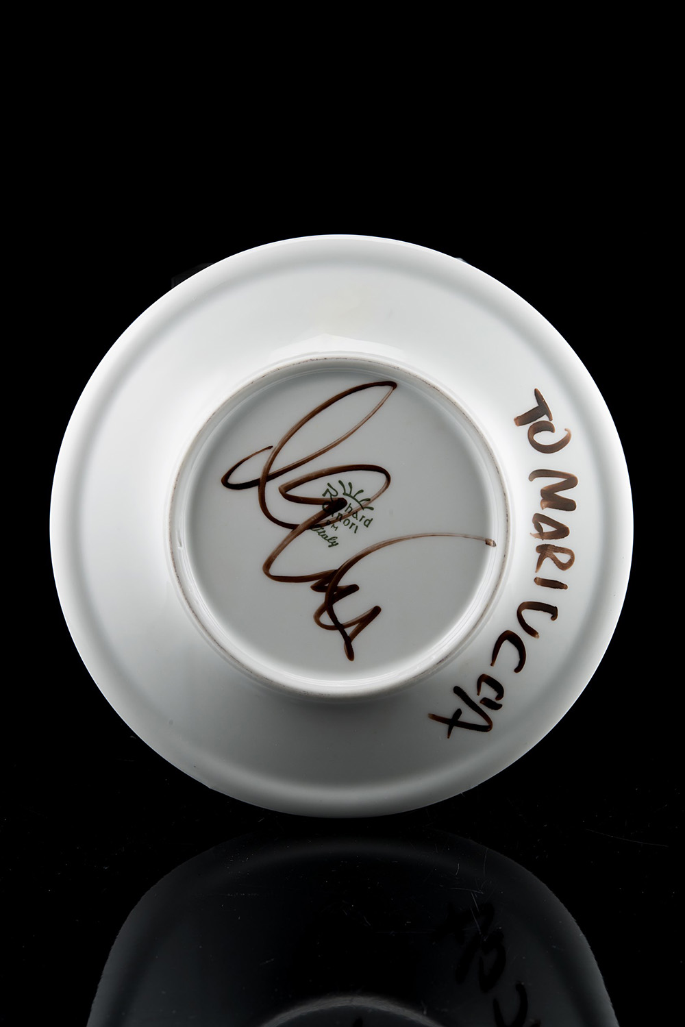 "Mariuccia" 1983, marker pen on porcelain, dish of "El Toulà" signed and dedicated on the reverse (d. cm 7,5)