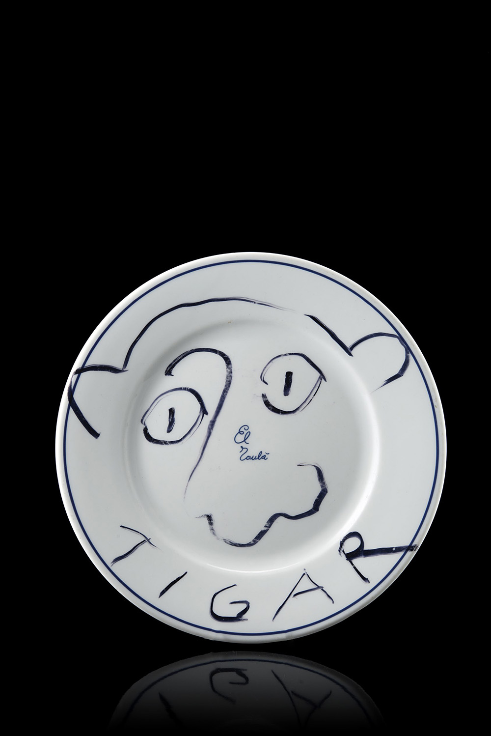 "Tigar" 1983, marker pen on porcelain, dish of "El Toulà" signed and dedicated on the reverse (d. cm 24,5)