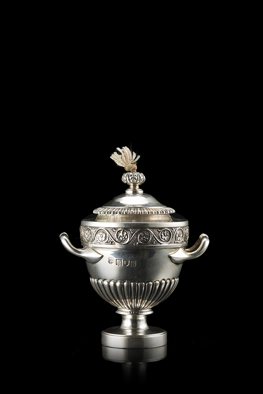 Stoppiniera in argento a forma di cratere, decorata da baccellature radiali e da una cintura di girali floreali. Londra, 1913, argentiere Henry & Arthur Vander (h. cm 9 ca.) (gr lordi 150 ca.) (lievi difetti)