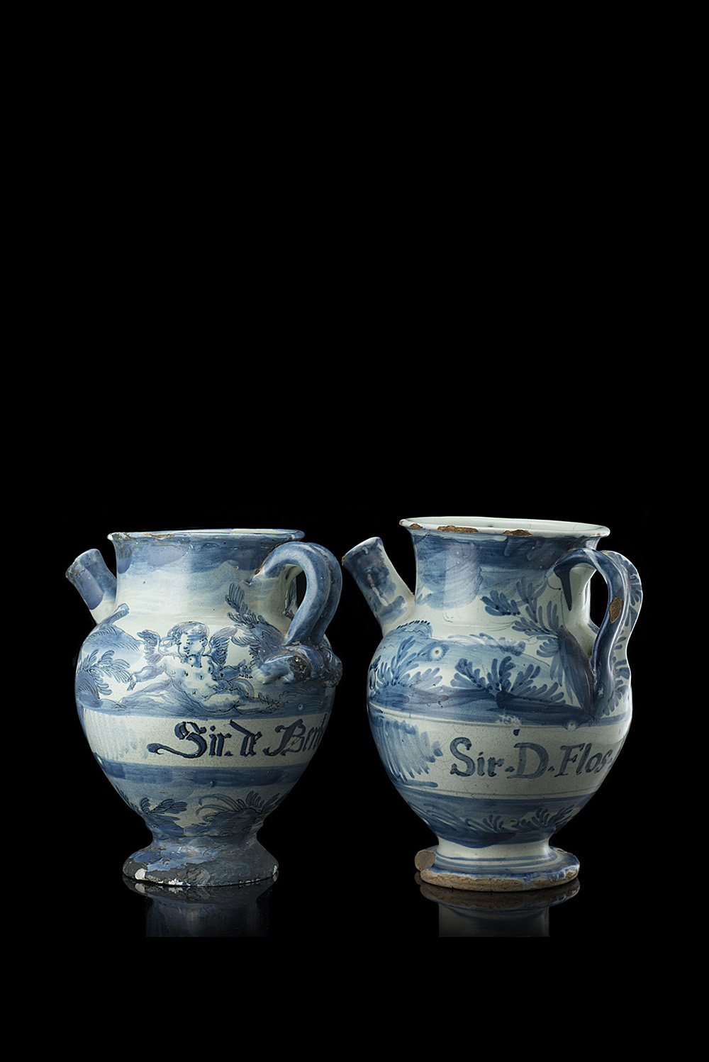 In entrambi, sotto al piede, è presente etichetta cartacea di esposizione alla mostra 'L'Antica ceramica ligure. Imperia ottobre 1976'. I due alberelli, simili di forma, si differenziano nella decorazione (uno presenta due putti e l'altro solo paesaggio con frasche) e nelle anse (uno a doppia corda a riccioli ed uno a nastro). Il versatoio contenente 'Sir. D. Berberil' presenta i contorni dei decori in bruno