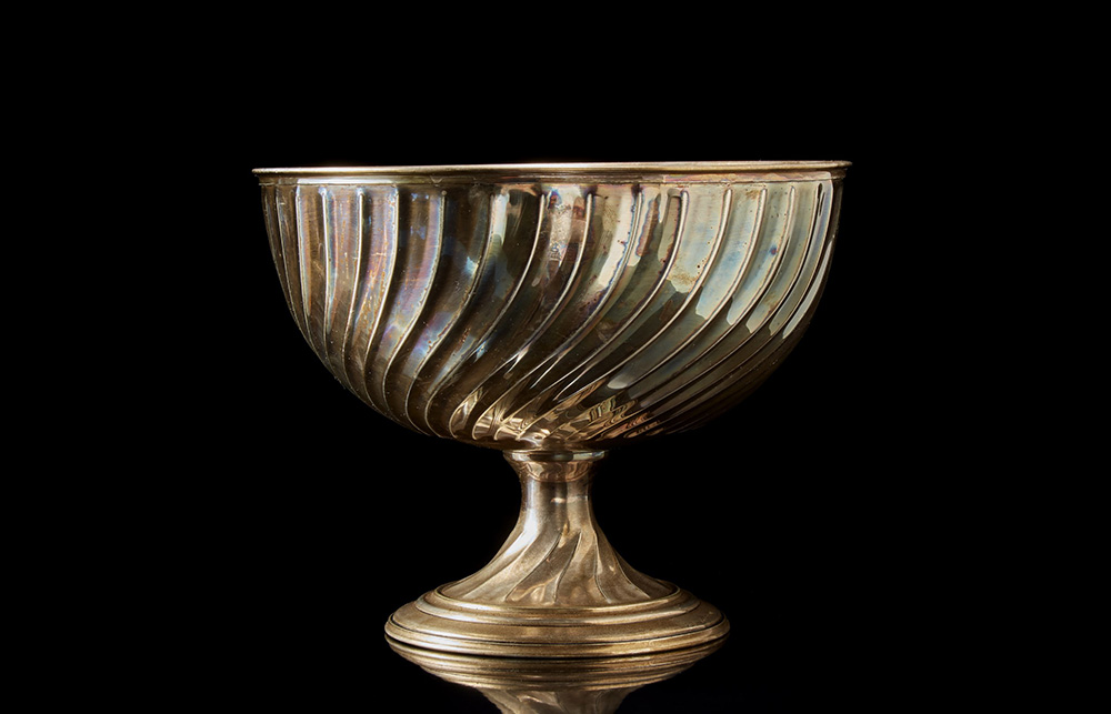 Alzata portafrutta in argento a corpo decorato a costolature tortili. Titolo...