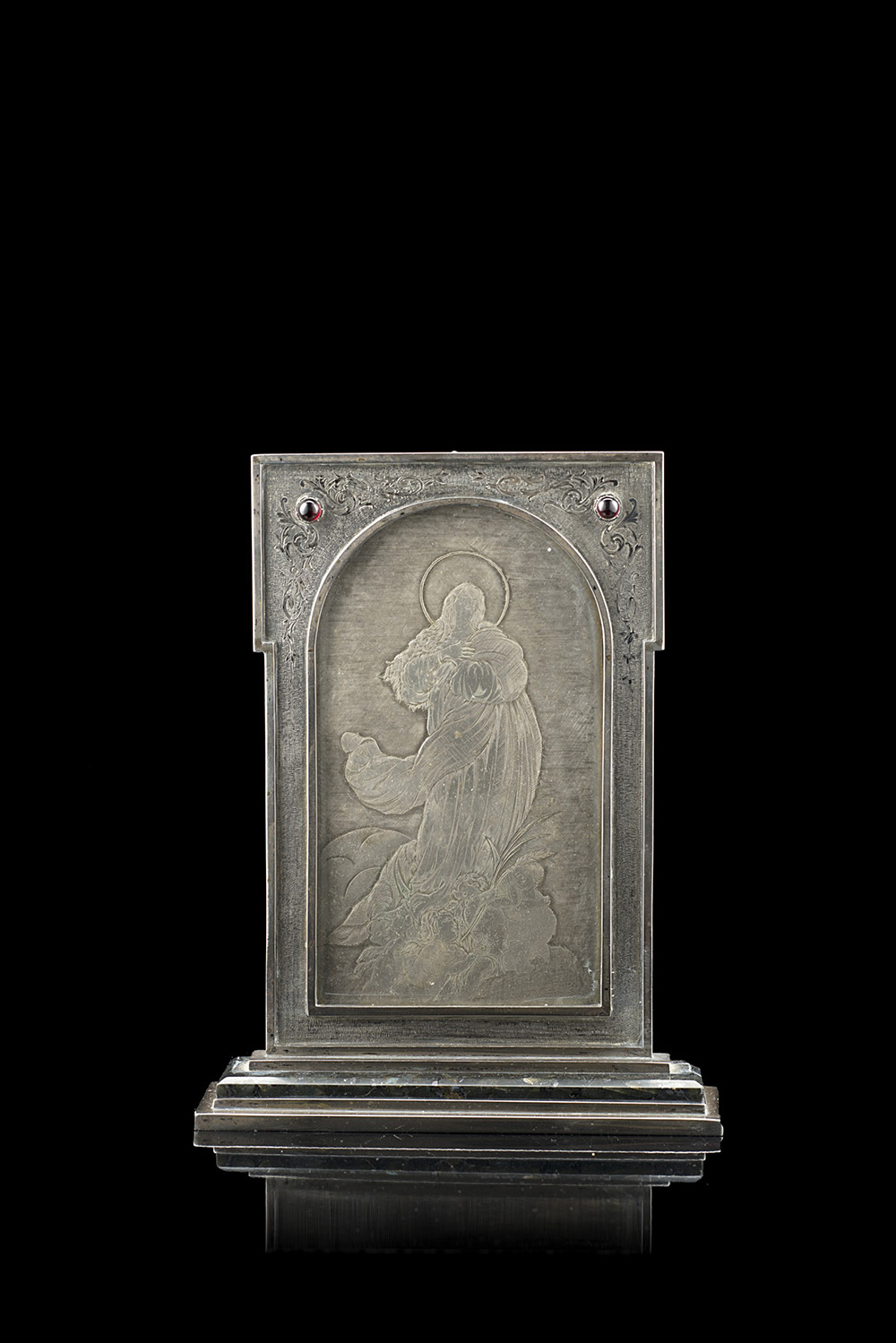 Placca in argento inciso a bulino raffigurante Ascensione della Vergine entro edicola, cesellata e zigrinata a girali fogliati su base gradinata con pietra. Italia, inizio sec. XX (h. cm 18,5x14,5) (gr lordi 500 ca.) (difetti)