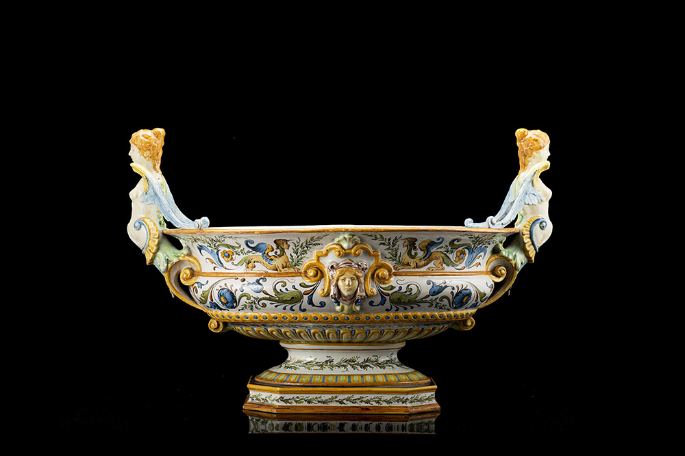 Centrotavola ovale in maiolica policroma con decoro a raffaellesche. Le due prese laterali sono foggiate in forma di figura fantastica alata (cm 50x35x28) Marca di fabbrica e numerali 635.1165. Doccia, Manifattura Ginori, 1890 circa.