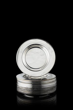 Gruppo di dodici piattini da pane in argento. Alessandria, metà sec. XX (d. cm 15) (gr 1660 ca.) (lievi difetti)