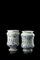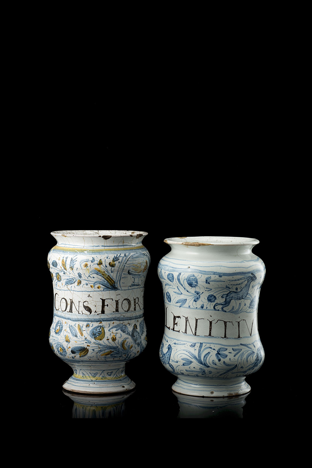 Due albarelli in maiolica a forma di rocchetto con decorazione a 'calligrafico naturalistico' ed al centro cartiglio farmaceutico. Uno si presenta in monocromia azzurra mentre l'altro è decorato in azzurro e giallo; sopra al cartiglio presenta lo stemma della spezieria religiosa di appartenenza (San Giovanni decollato). Faenza, sec. XVII (h. cm 18) (difetti e rotture)