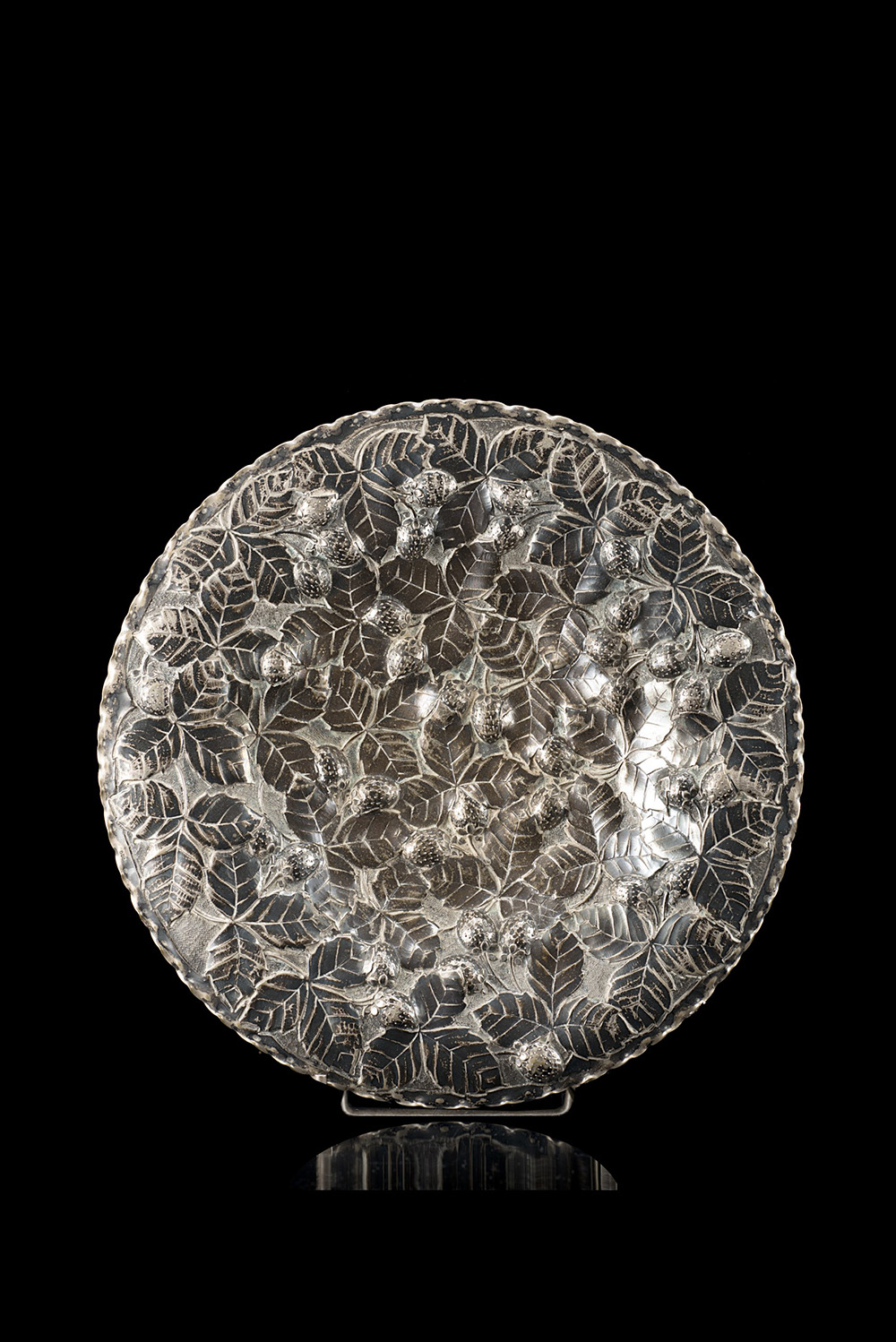 Alzata tripode di forma circolare con superficie sbalzata con frutti e foglie. Italia, inizio sec. XX (d. cm 27 ca.) (gr 440 ca.) (difetti)