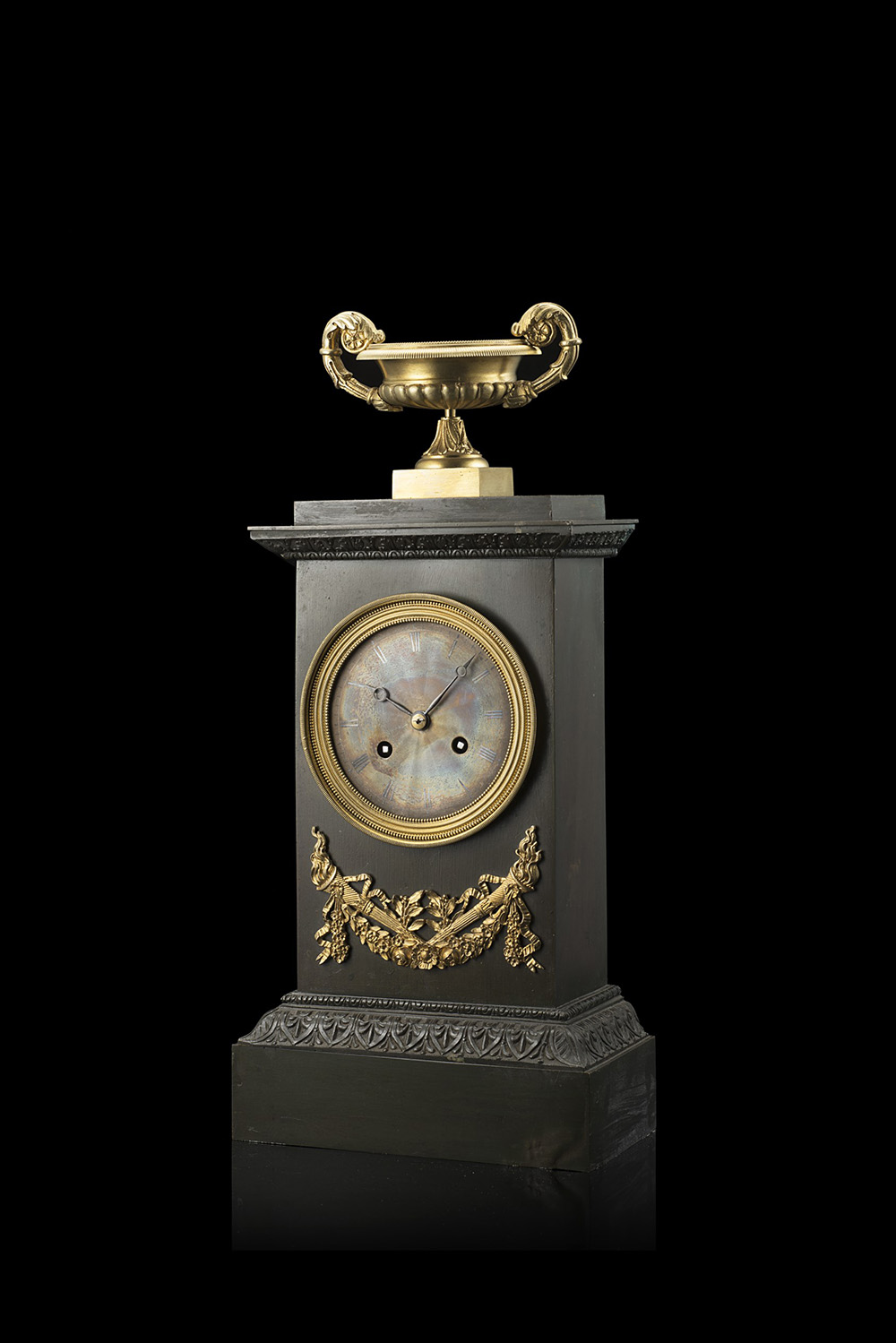 Pendola da tavolo in bronzo brunito sormontata da vaso in bronzo dorato