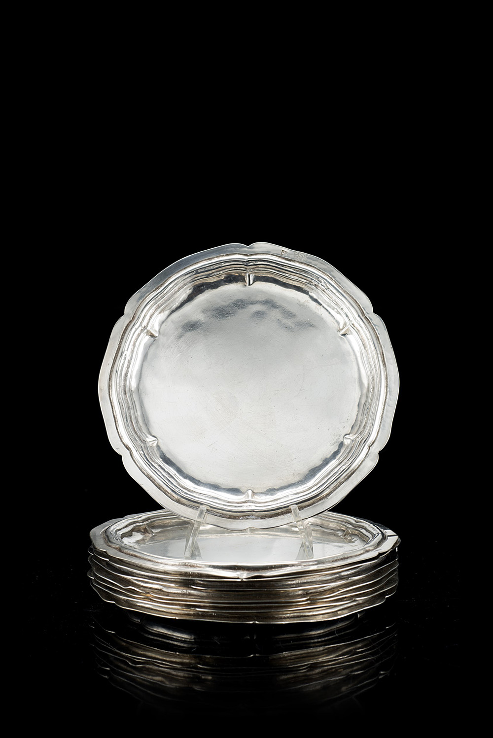 Otto piattini in argento di forma circolare sagomata con fondo liscio e tesa modanata. Marchi di imitazione del Regno di Napoli. Italia, sec. XX (d. cm 14 ca.) (gr 930 ca.) (difetti)