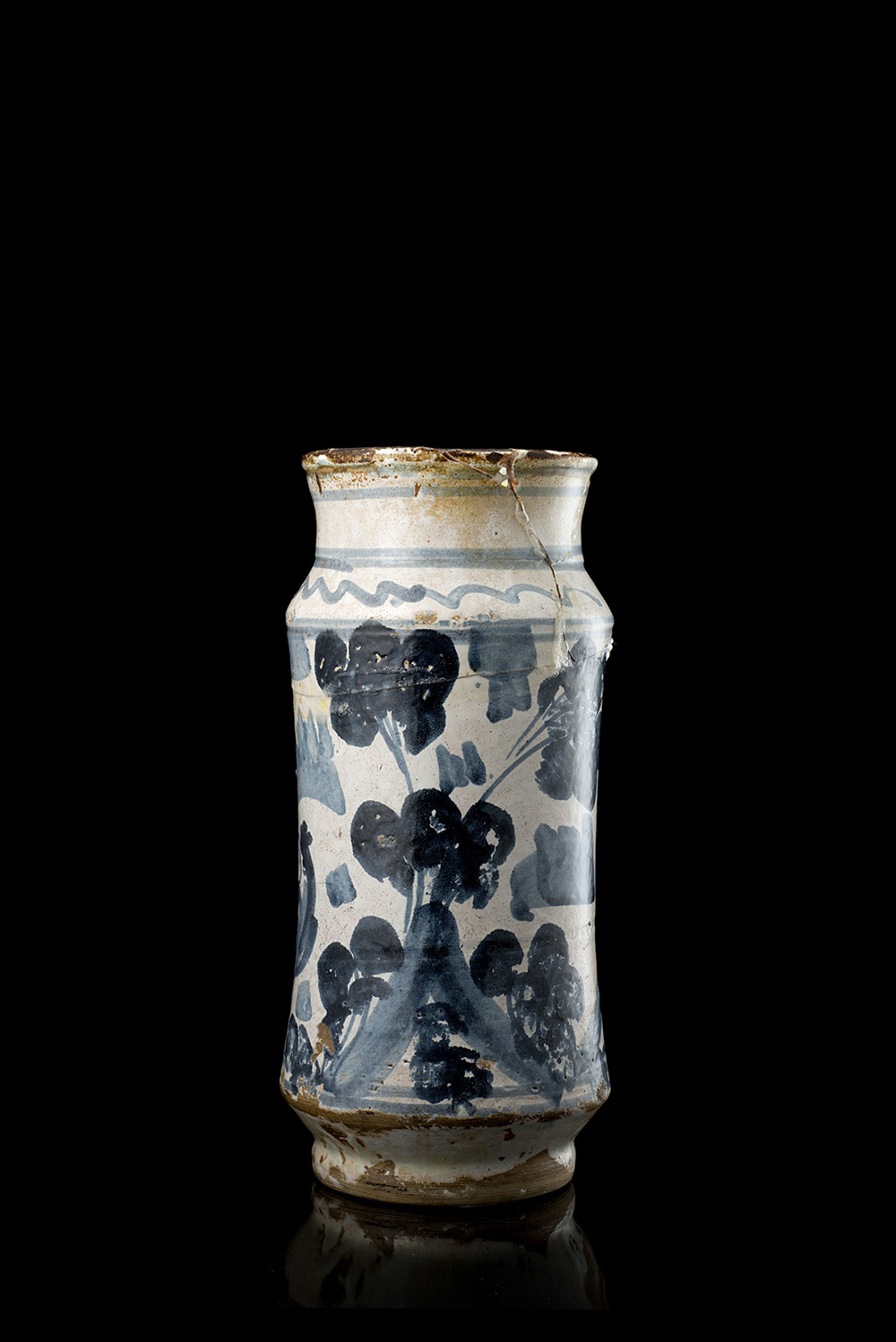 A majolica albarello. Spain, 18th century (h. cm 26,5) (losses and brekage)