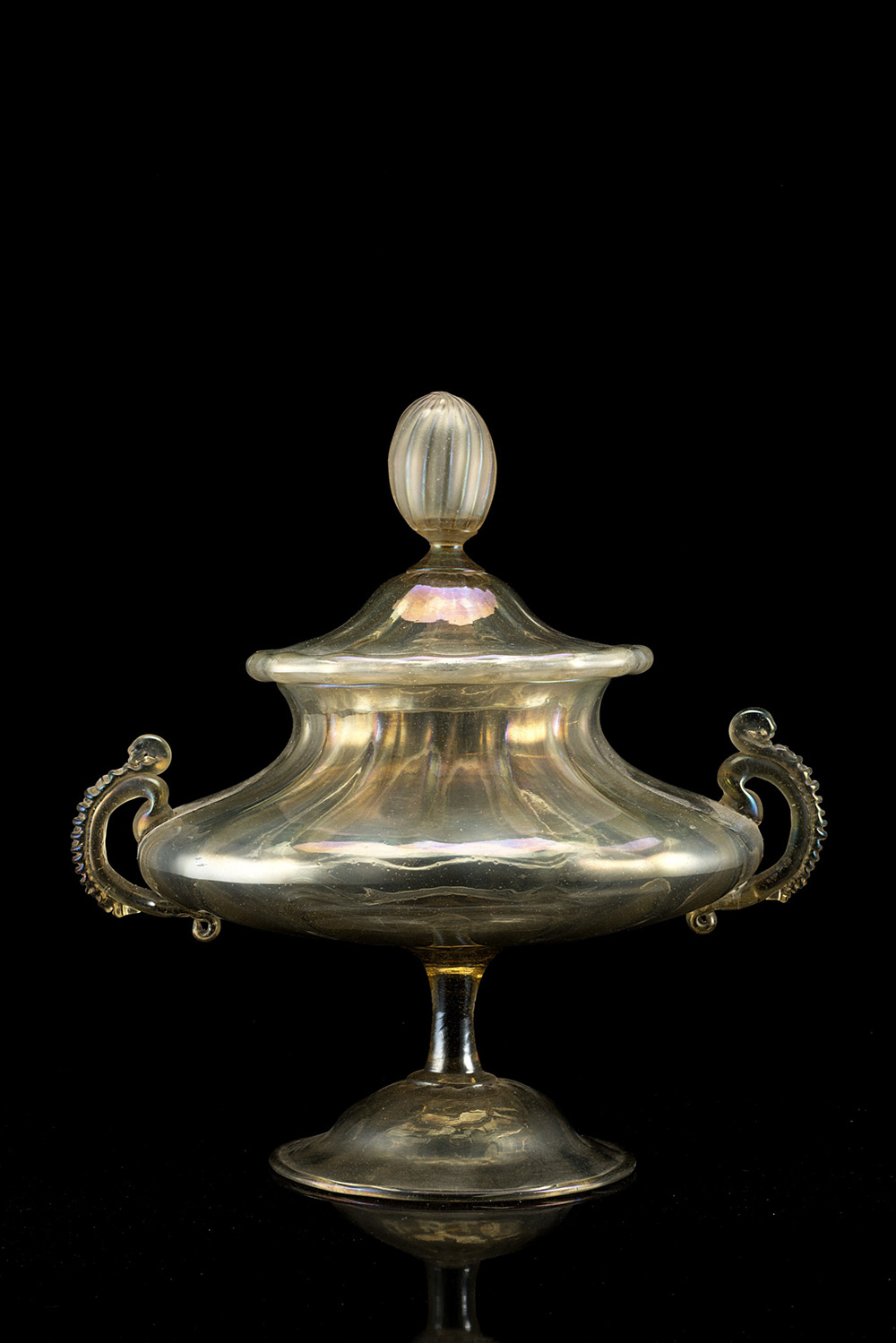 Manifattura di Murano, sec. XIX. Coppa biansata in vetro soffiato con coperchio. Corpo costolato e anse decorate a volute (h. cm 28) (difetti)