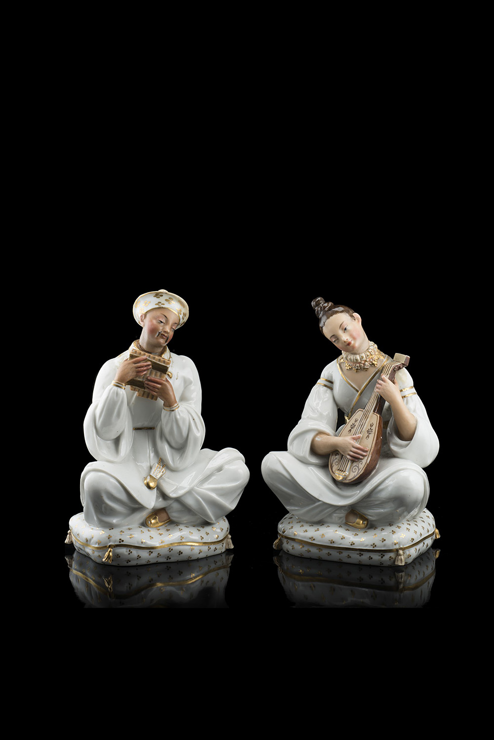 Coppia di flaconi da profumo in forma di Cinesi in porcellana tenera (h. cm 19 ca). Una donna cinese suona un mandolino a gambe incrociate su un cuscino con nappe ed un uomo con copricapo suona un piffero nella stessa posizione. Profili in oro. Le due teste costituiscono i tappi delle bottiglie. Senza marca ma con numerali incussi 54 e 55. Francia, sec. XIX (rotture ad un tappo, minimi restauri e usure all’oro)