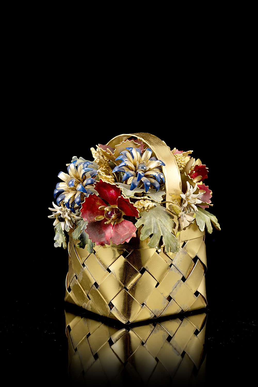 Modellino di cestino di fiori in argento (925/1000) dorato e smalti. Sec. XX, firmato Cartier (h. cm 8 ca) (gr lordi 170 ca.) (lievi difetti)