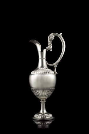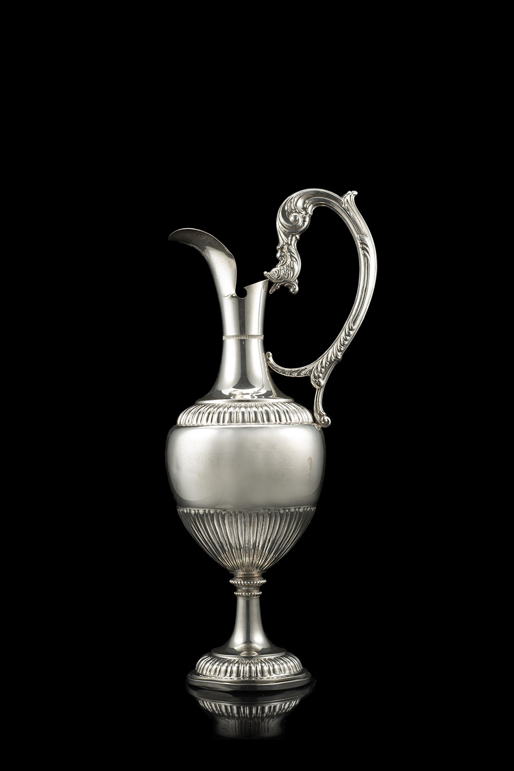 Caraffa in argento con corpo ovoidale su piede circolare rastremato, decorato con fasce di baccellature radiali; versatoio sagomato e manico ad ansa fogliata con attacco zoomorfo. Italia, metà sec. XX (h. max 37 ca.) (gr lordi 510 ca.) (difetti)