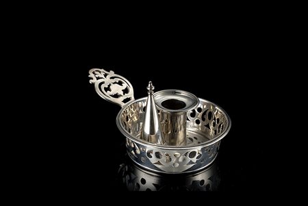 Bugia in argento di forma circolare con sponda e manico traforati a motivi...