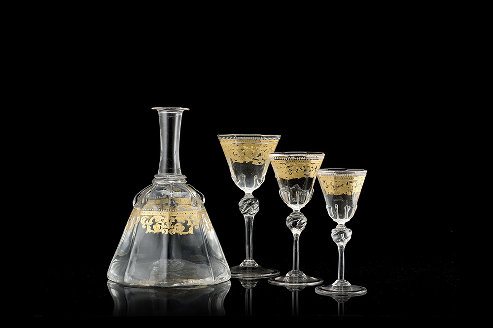 Manifattura di Murano, sec. XIX. Servizio di bicchieri in vetro soffiato con coppe ottagonali decorate a gioiello e volute dorate, composto da dieci calici per acqua, sei da vino, sette da liquore e una bottiglia (lievi difetti)
