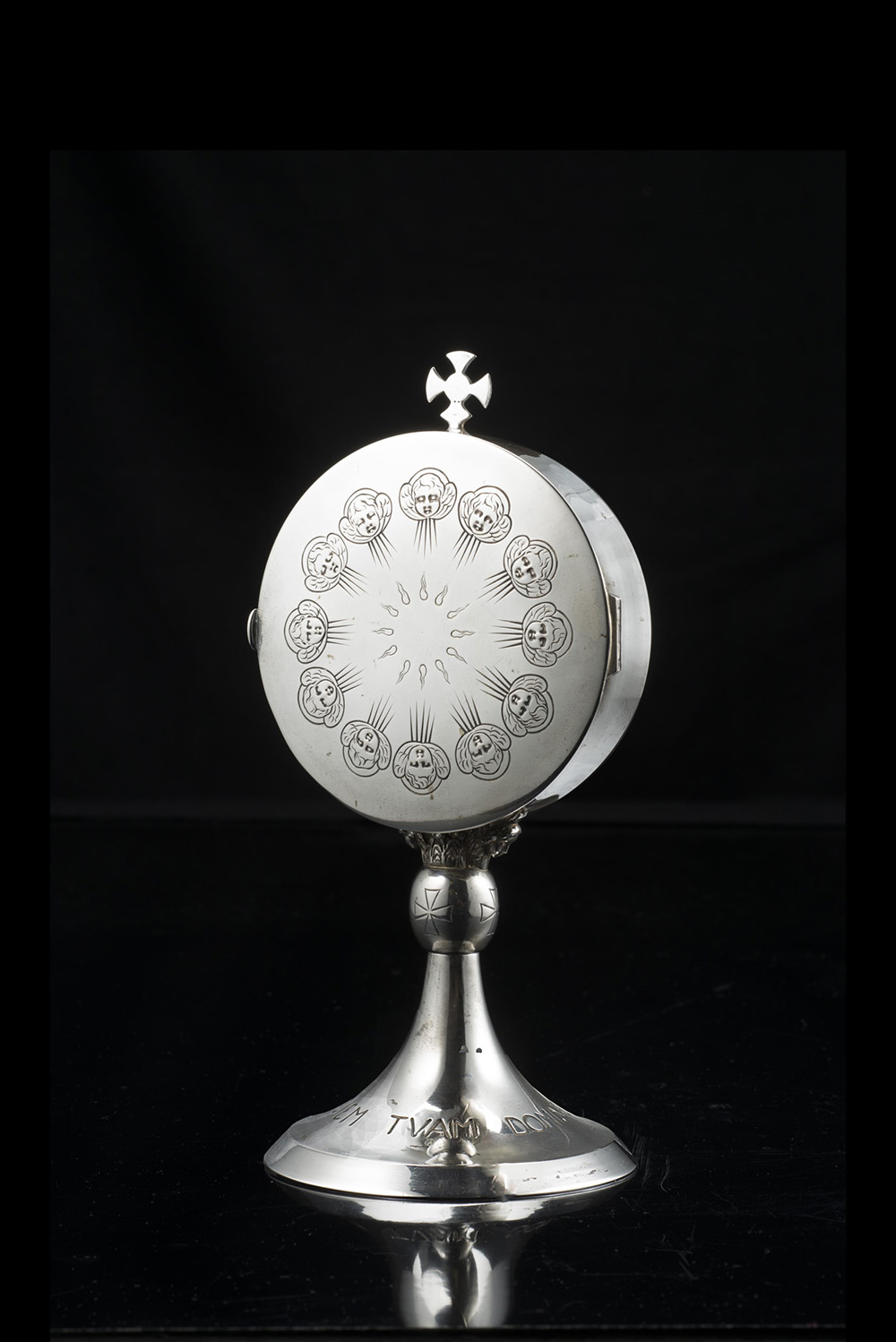 Pisside in argento con teca incisa da cerchio di cherubini con sole stilizzato centrale; piede circolare, con iscrizione: 'FACIEM TUAM DOMINE REQUIRAM'; fusto rastremato e nodo ovoidale; croce patente a tutto tondo. Italia, inizi sec. XX (h. cm 23) (gr 400 ca.) (lievi difetti)