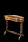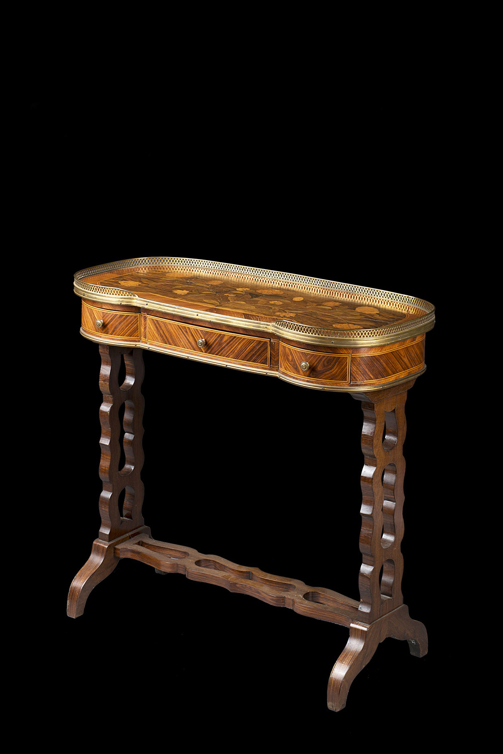 Tavolino a fagiolo da centro lastronato in legni vari con piano intarsiato a mazzi fioriti. Fascia a tre cassetti decorata da ringhiera in ottone traforato. Gambe e traverse sagomate. Sec. XIX (cm 78x74x34)
