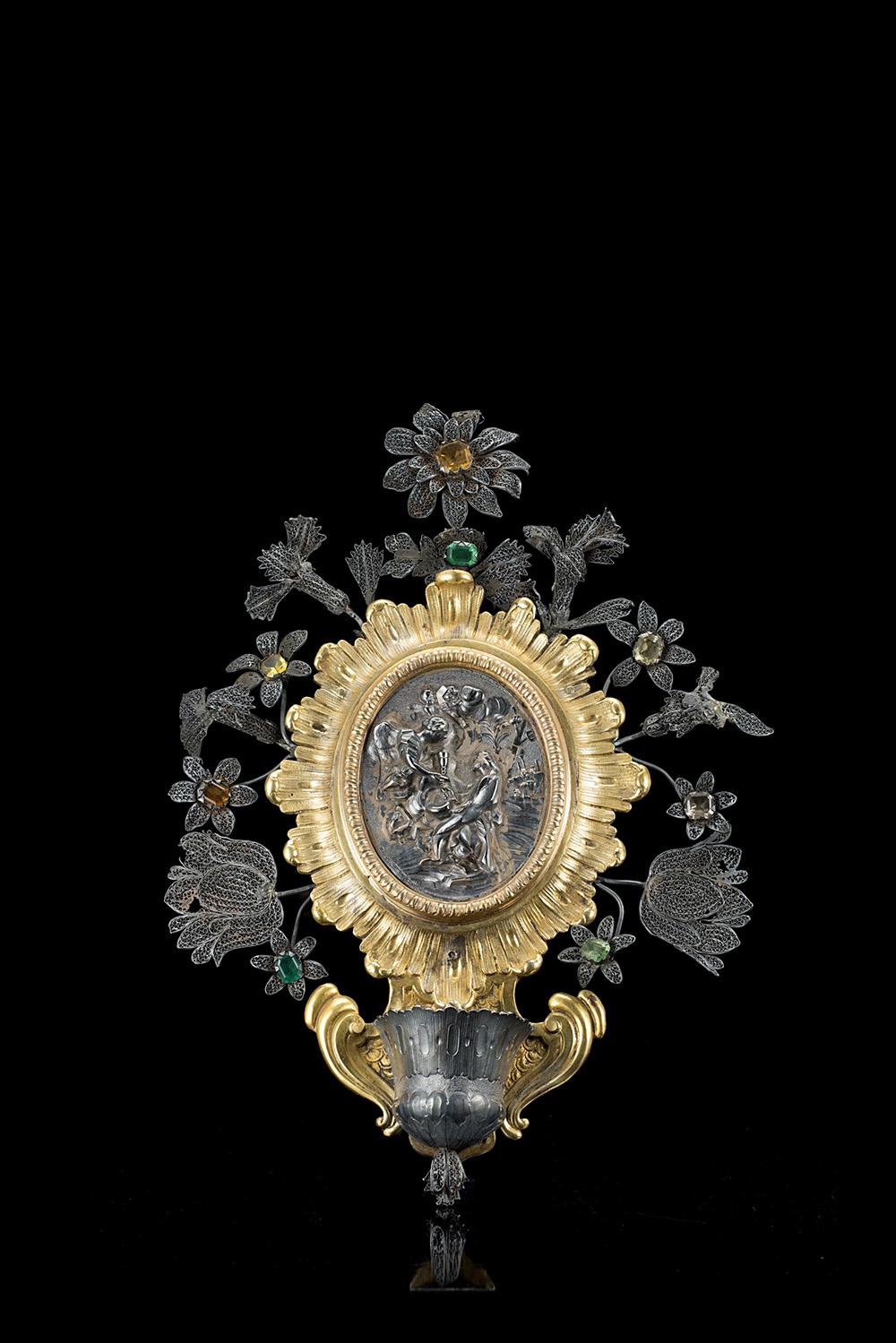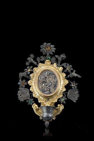 A gilt and silvered copper holy water font with filigree frame. 19th century (cm 34x24 ca.) (defects and restorations)