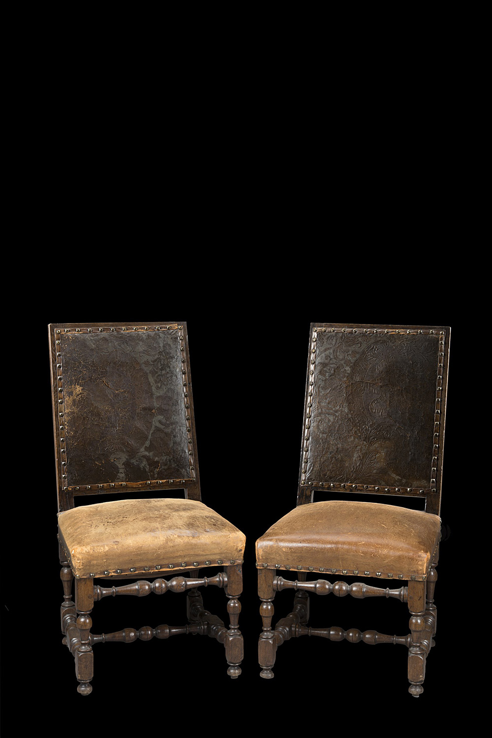 Coppia di sedie "a rocchetto" in noce con seduta e schienale in cuoio lavorato e decorato a borchie. Toscana, sec. XVI (difetti)
