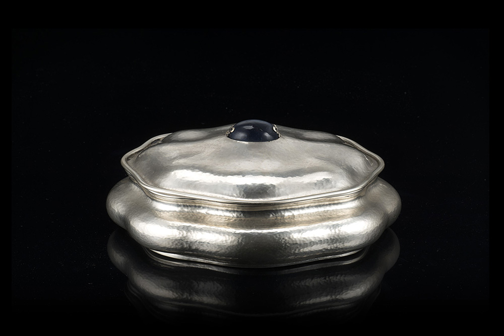 Scatola in argento di forma ovale bombata e sagomata con superficie martelè, cabochon in pietra blu. Interno dorato. Milano, inizio sec. XX. Argentiere Miracoli (cm 19x24xh. cm 6) (gr lordi 350 ca.) (lievi difetti)