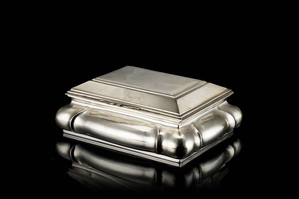 Scatola in argento di forma rettangolare bombata e sagomata. Milano, sec. XX. Argentiere Miracoli (cm 22x17,5xh. cm 7 ca.) (gr 1150 ca.) (lievi difetti)