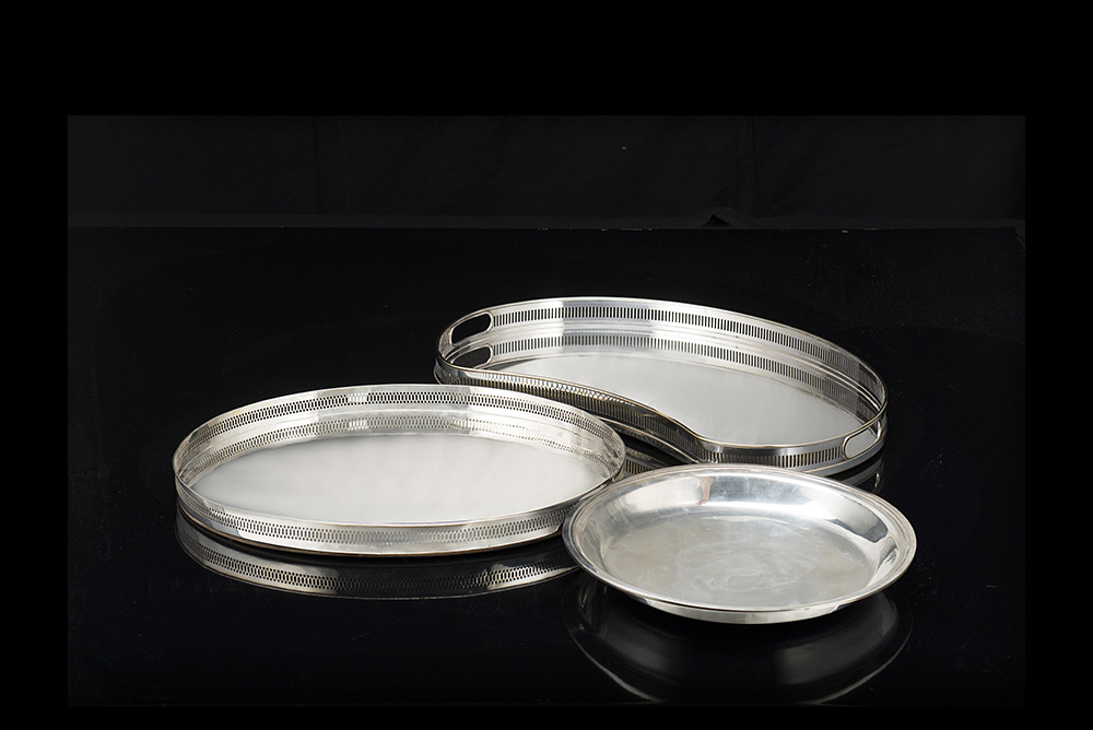 Lotto di tre vassoio di cui due in argento, uno di forma ovale con ringhiera, Italia inizi sec. XX e l'altro di forma circolare con bordura modanata, Milano, inizi sec. XX, argentiere Miracoli (gr 1780 ca.) e uno in metallo argentato (cm 47x37,5 ca.; d. cm 33,5 ca.; lungh. cm 55 ca.) (difetti)
