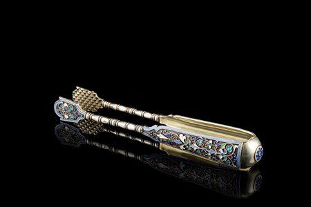 Pinza per zucchero in argento e smalti policromi cloisonnè, decorata a motivi floreali stilizzati su fondo zigrinato. Mosca 1884-1897, argentiere Ivan Saltikov; marchio di importazione in Francia 1864-1893 (cm 15 ca.) (gr 55 ca.) (lievi difetti)