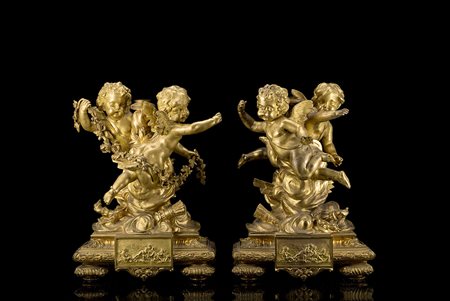 Coppia di basi per lampade in bronzo dorato raffiguranti putti alati con nastri fioriti poggianti su nuvole con faretre e fiamme. Basi squadrate decorate con placche con amorini. Piedi torniti (h. cm 40) (difetti e mancanze)