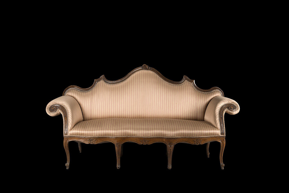 Divano a orecchioni in noce con schienale sagomato, montanti, fascia e gambe intagliati. Sec. XVIII (difetti e restauri)