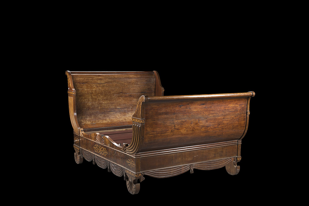 Letto a barca ad una piazza e mezzo in mogano intarsiato in bosso a volute e motivi vegetali. Montanti sagomati a cornucopie stilizzate. Sec. XIX (difetti)