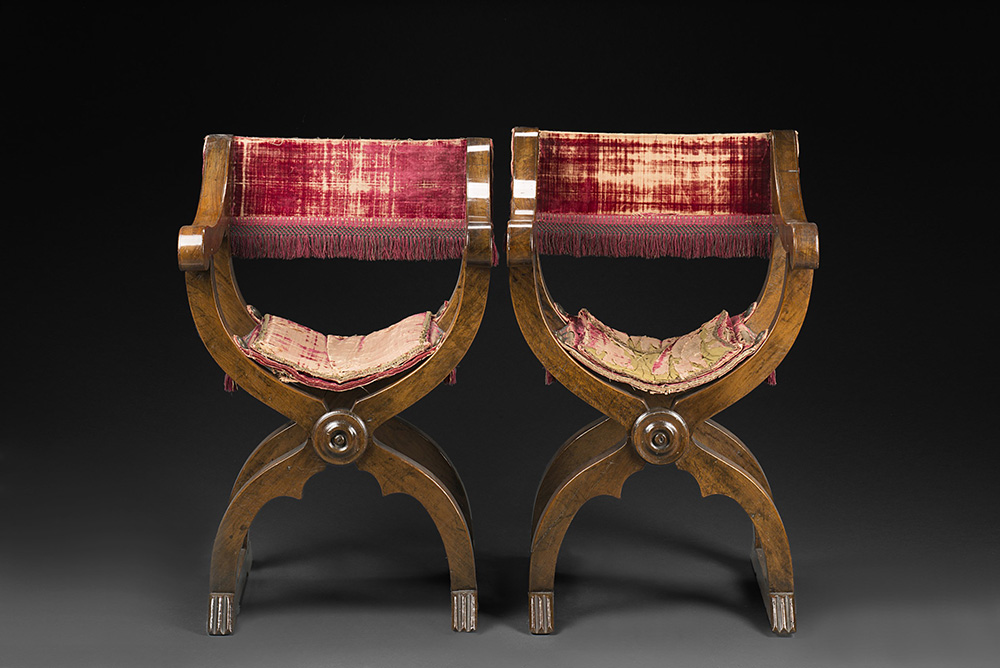 Due antiche poltrone "Savonarola" pieghevoli in noce, braccioli mossi, montanti a ‘X’ centrati da elemento decorativo. Piedi stilizzati. Seduta e schienale in velluto (difetti)