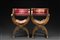 Due antiche poltrone "Savonarola" pieghevoli in noce, braccioli mossi,...