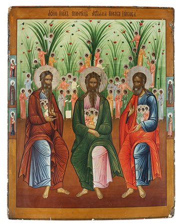 A large icon on panel depicting Saints, 19th century (cm 89x70) (defects)