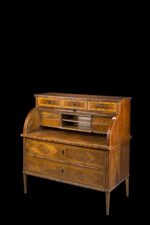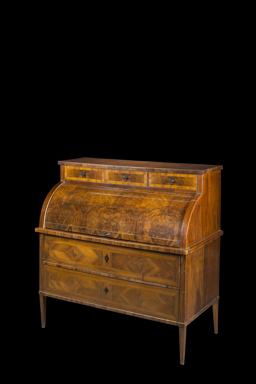 Ribalta a rullo con alzata in noce e radica di noce. Due cassetti nella parte inferiore, piano scrittoio estraibile, cassettini e vani nella calatoia, tre cassetti nella parte superiore. Quattro gambe rastremate. Inizio sec. XIX (cm 130x132x68,5) (difetti)