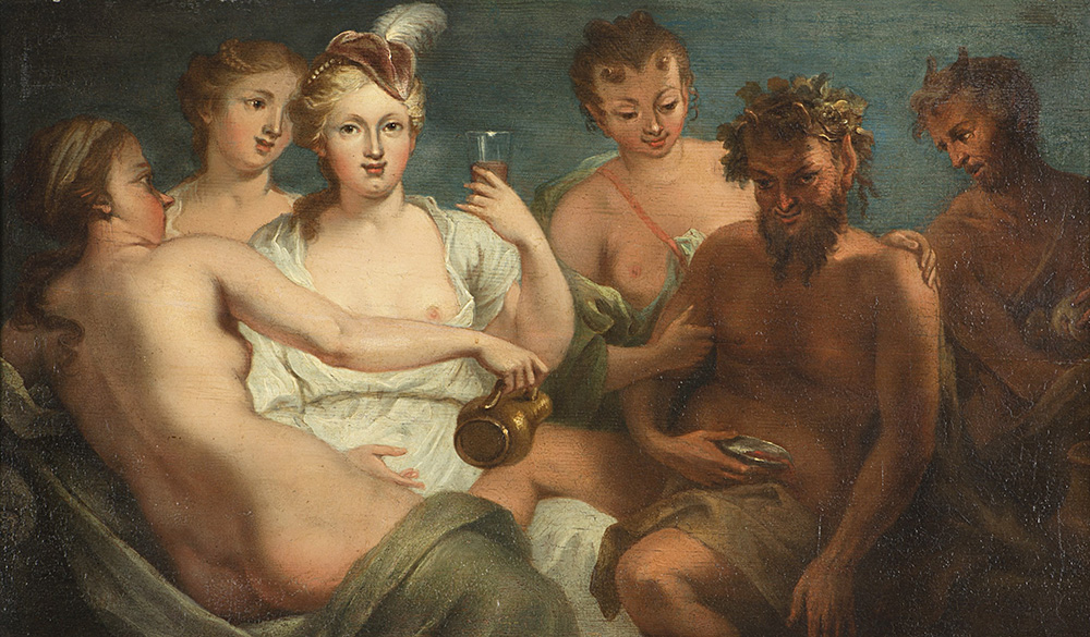 Ignoto del secolo XIX "Scena bacchica" olio su tavola (cm 37x64,5) in cornice coeva (difetti)