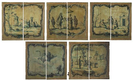 Scuola veneta, sec. XIX "Allegorie" gruppo di cinque pannelli divisi in ante...