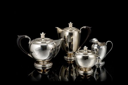 Servizio da tè e caffè in argento, di gusto decò, composto da caffettiera,...