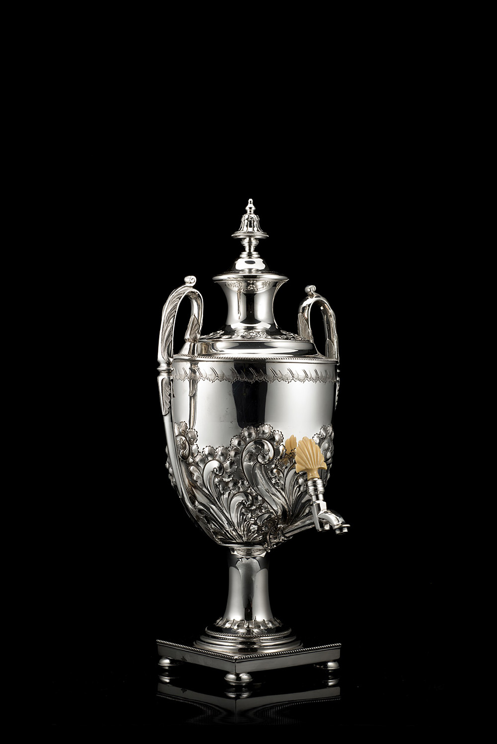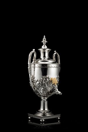 Samovar ad urna biansata in metallo argentato, decorato con fasce di volute fogliate e bordi perlinati; piede quadrato su piedini a sfera schiacciata, coperchio sciancrato con cimatura a trottola e presa del rubinetto in avorio. Inghilterra, sec. XX (h. cm 53 ca.) (difetti)
