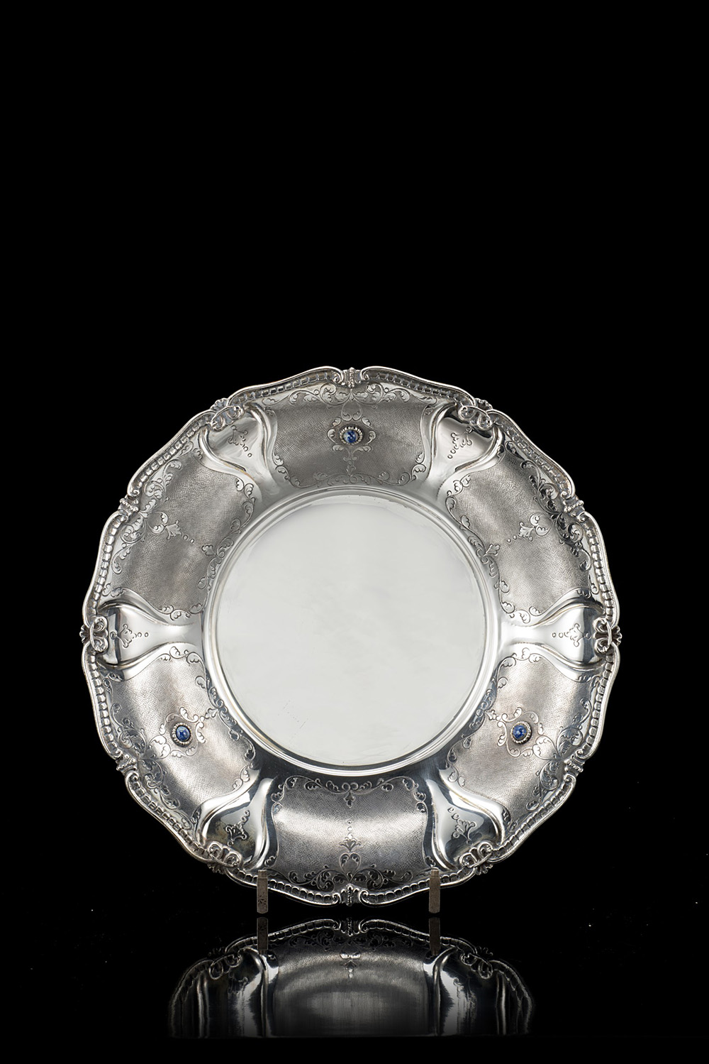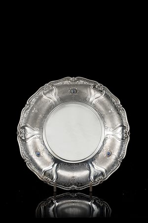 Piatto in argento di forma circolare sagomata, con tesa decorata da riserve zigrinate, motivi fitomorfi e cabochons in lapislazzuli. Italia, metà sec. XX (d cm 30 ca.) (gr lordi 700 ca.) (lievi difetti)