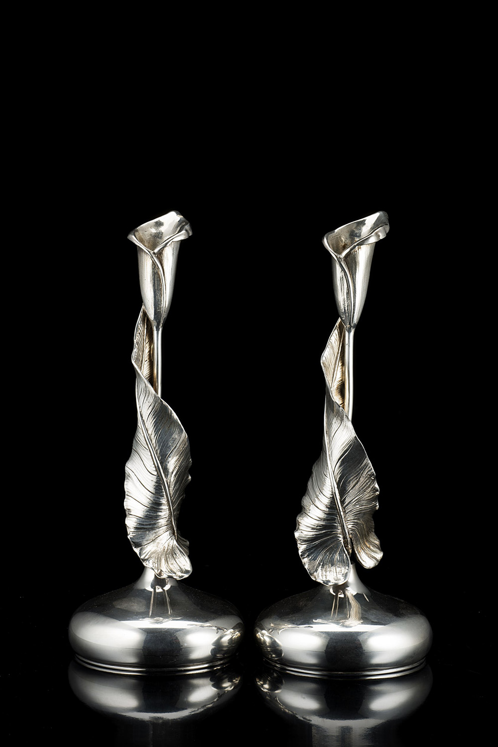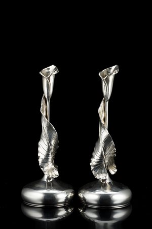 Coppia di candelieri in argento a forma di calla con base circolare bombata...