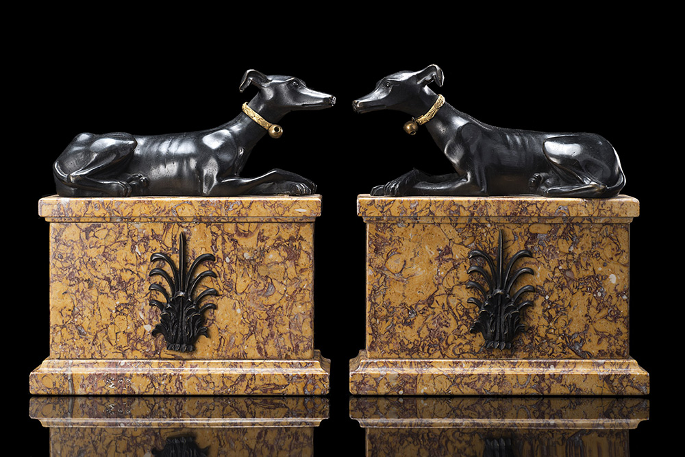 Coppia di obelischi raffiguranti levrieri accucciati poggianti su basi a plinto in broccatello di Siena decorate da fregi (cm 18x20)