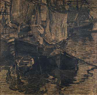 Mario Puccini Livorno 1869 - Firenze 1920 BARCHE IN PORTO carboncino su carta, cm 33,6x34. Firmato in basso a destra: M° Puccini Provenienza: Firenze, Raccolta Pasquael Di Pietro (iscrizione al retro) Esposizioni: Livorno, Casa Comunale della Cultura, Mostra retrospettiva di Mario Puccini, luglio 1957 n. 1 (timbro ed etichetta al retro) Bibliografi a: Mario Puccini, catalogo della mostra, a cura di R. Monti, Livorno 1957, s.p; R. Tassi, Mario Puccini, testo critico di R. Monti, Firenze 1992, p.434,472,n.16