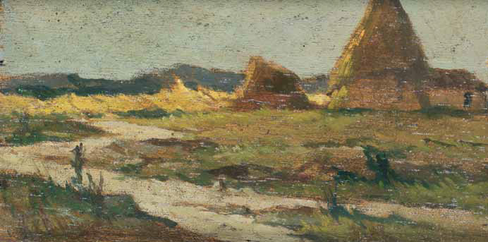 Giovanni Fattori Livorno 1825 – Firenze 1908 PAESAGGIO CON CASOLARE E PAGLIAI, 1868-1870 olio su tavola, cm 10x21. Firmato in basso a sinistra: Gio. Fattori. L’opera è registrata presso gli Archivi dell’Istituto Matteucci con il n. 417058 in data 24/10/2016