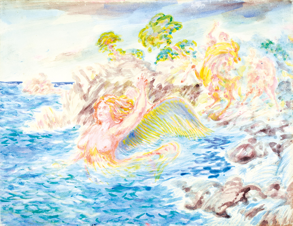 ALIGI SASSU (Milano 1912 - 2000), Sirena alata, 1985 acrilici su carta intelata, 50x65 firma in basso a destra, firma data e titolo al retro provenienza: Galleria d'Arte 32 Milano collezione privata Treviso