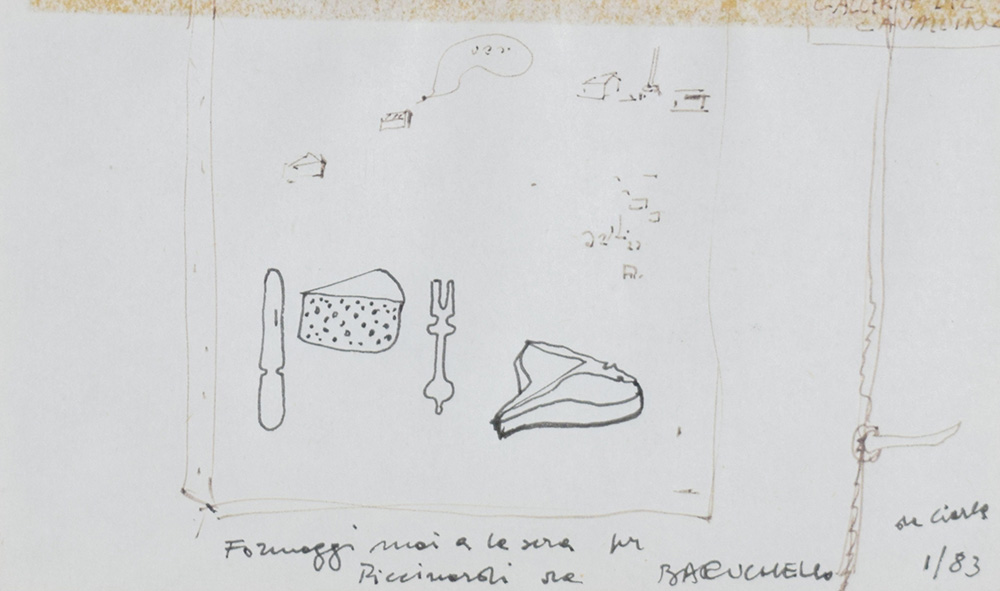 GIANFRANCO BARUCHELLO (Livorno 1924), Formaggi mai a la sera, 1983 tecnica mista su carta, 10x16 firma data titolo e dedica ad personam in basso acquisito dall'attuale proprietario direttamente dall'Artista