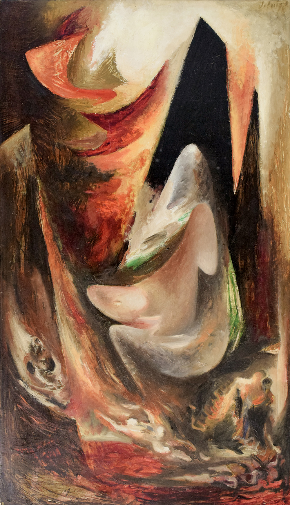MARIO DELUIGI (Treviso 1901 - Venezia 1978) Amori, 1948-50 olio su tavola, 95x55 firma in alto a destra esposizioni: Anfiteatro Arte Milano - etichetta al retro