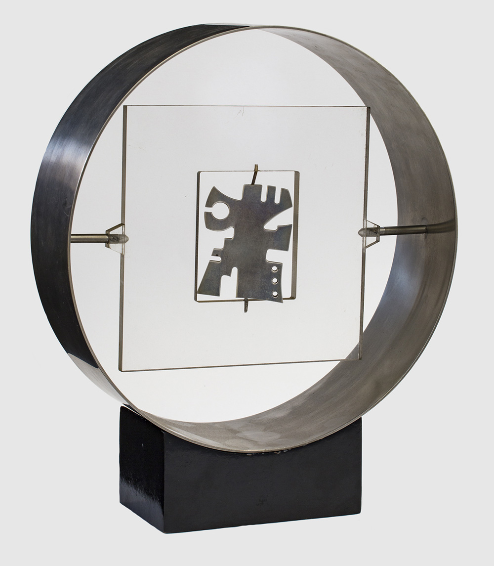 Scultura in acciaio e plexiglass poggiante su base in legno dipinta