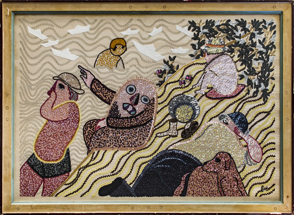ENRICO BAJ (1924-2003)La Baignade, 1972Ricamo a paillettes su tessuto...