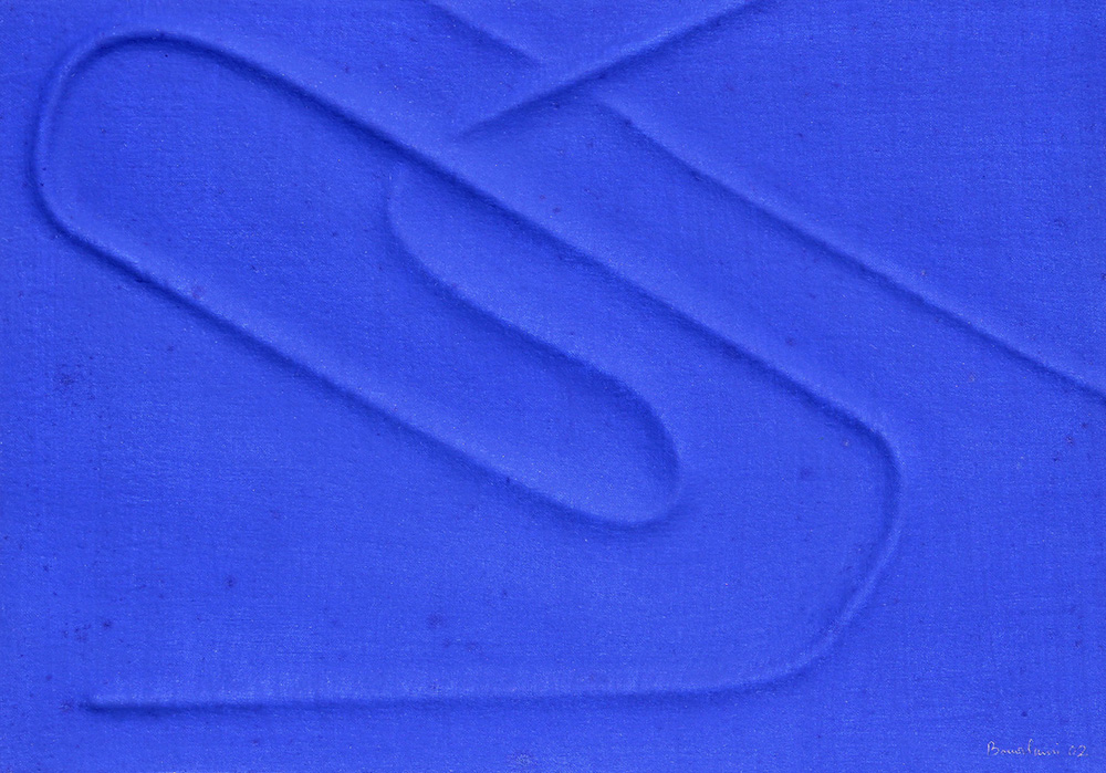Agostino BONALUMI (Vimercate (MI) 1935-07-10 Desio, 2013 ) Blu acrilico su cartoncino estroflesso cm. 35 x 50Firma, data "Bonalumi, 02" (in basso a destra) Autentica dell'artista su fotografia