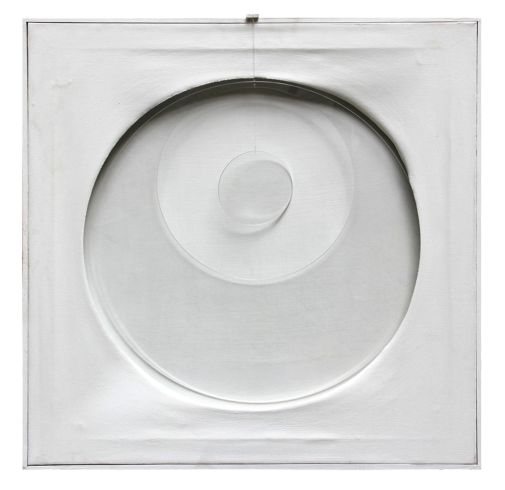 Sara CAMPESAN (Mestre, 1924 ) Immagine circolare 1965 acrilico su tela e perspex su tavola cm. 70 x 70Firma, data, luogo, tecnica, titolo "Sara Campesan, 65, Venezia, tela e perspex, Immagine circolare"; timbro dell'artista (al retro)